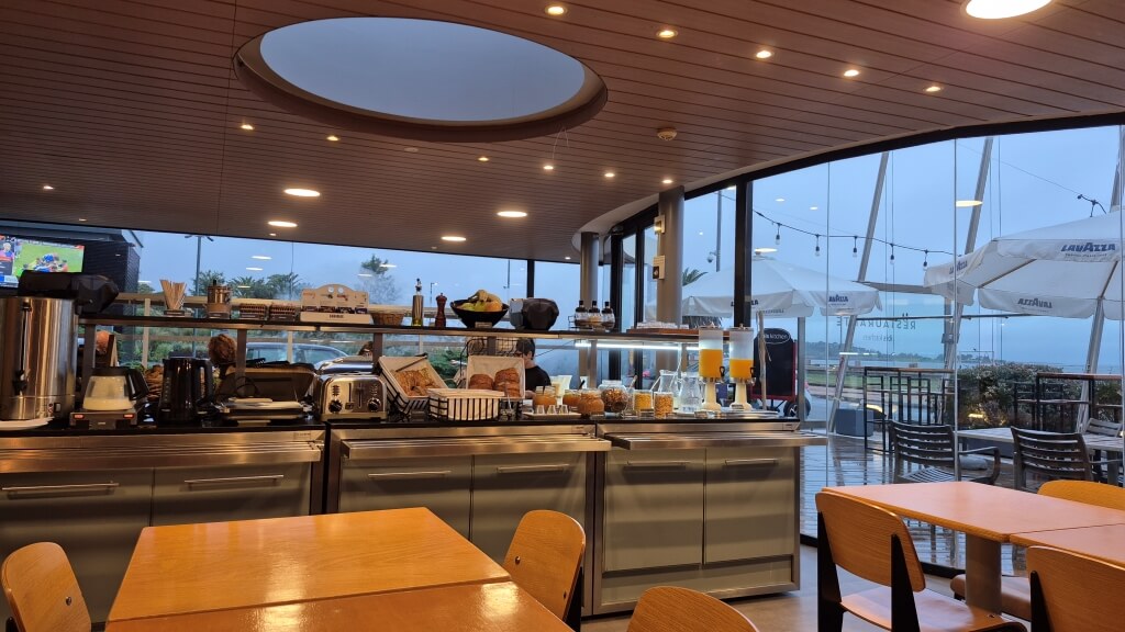 Um dos pontos altos é o café da manhã servido em um salão com janelas voltadas para o Rio da Prata.